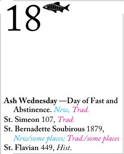 At the beginning of the calendar, there’s an entire page on spiritual fasting and the symbols that each day indicate. Here’s a look at Ash Wednesday, and what it prescribes.